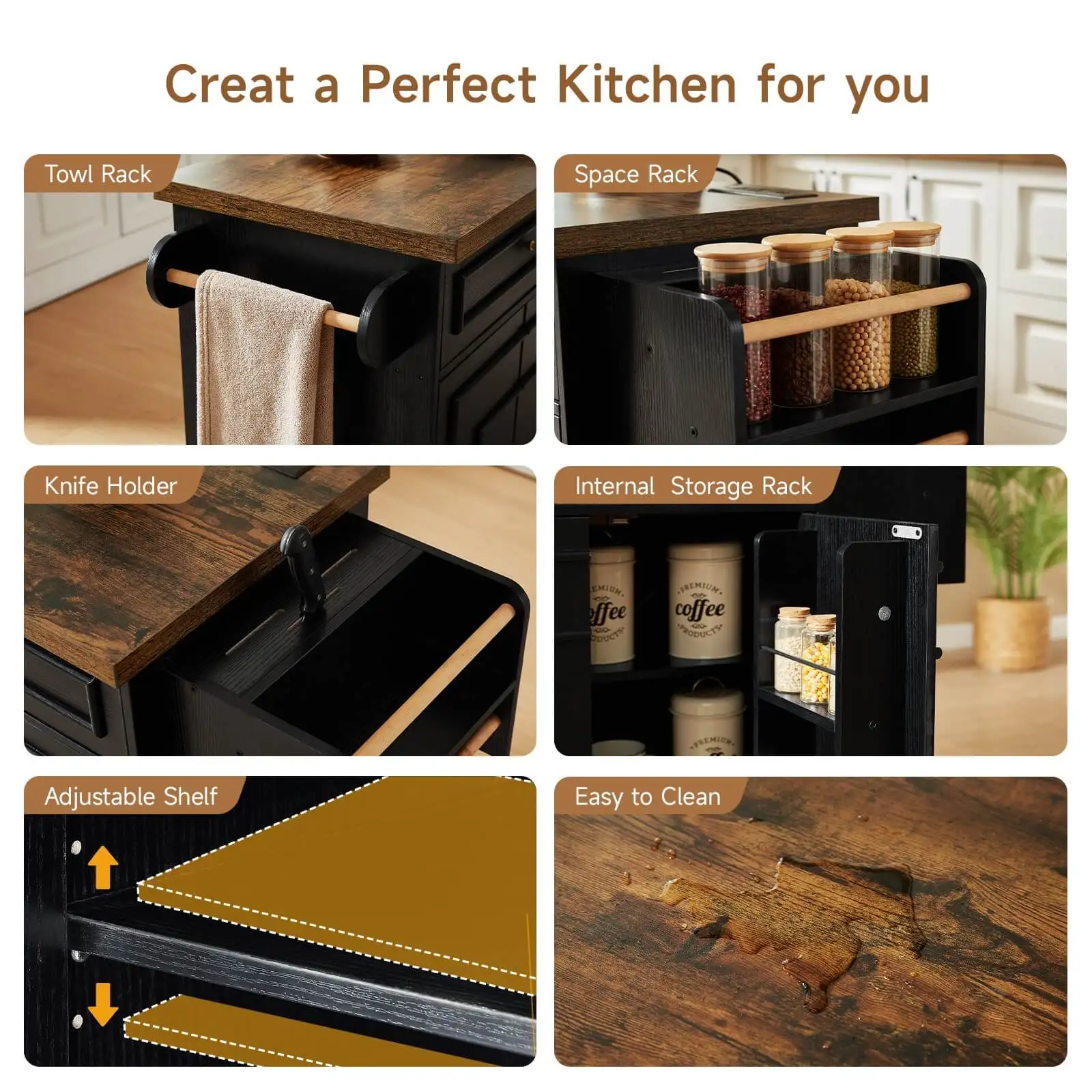 •Ample Storage: Product size: 58" L x 17.7" W x 35.4" H. Two spacious cabinets, two drawers, a towel rack, and a spice rack provide generous storage options for kitchen essentials.
