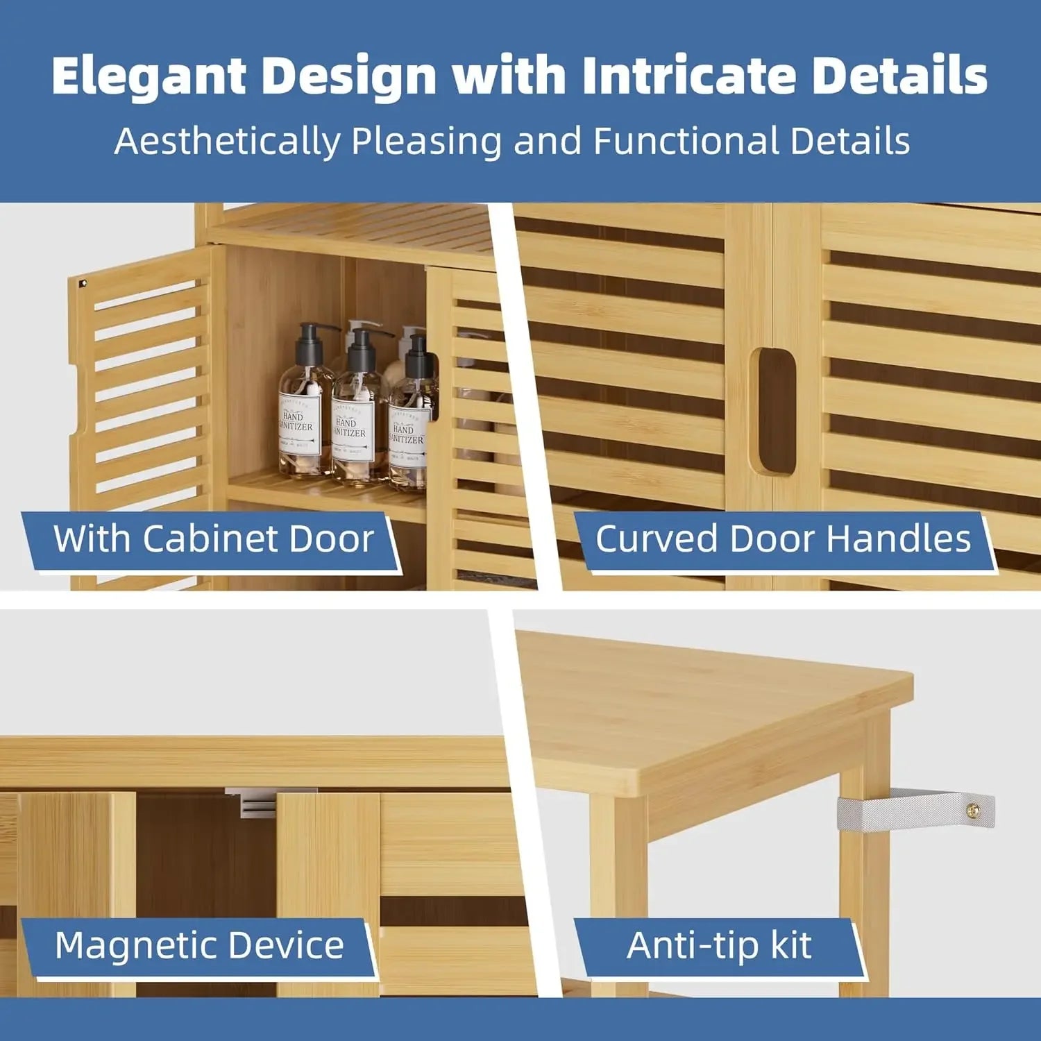 - You get a freestanding bamboo cabinet with four tiers, a door, and a shelf, designed for flexible bathroom, kitchen, or hallway storage.