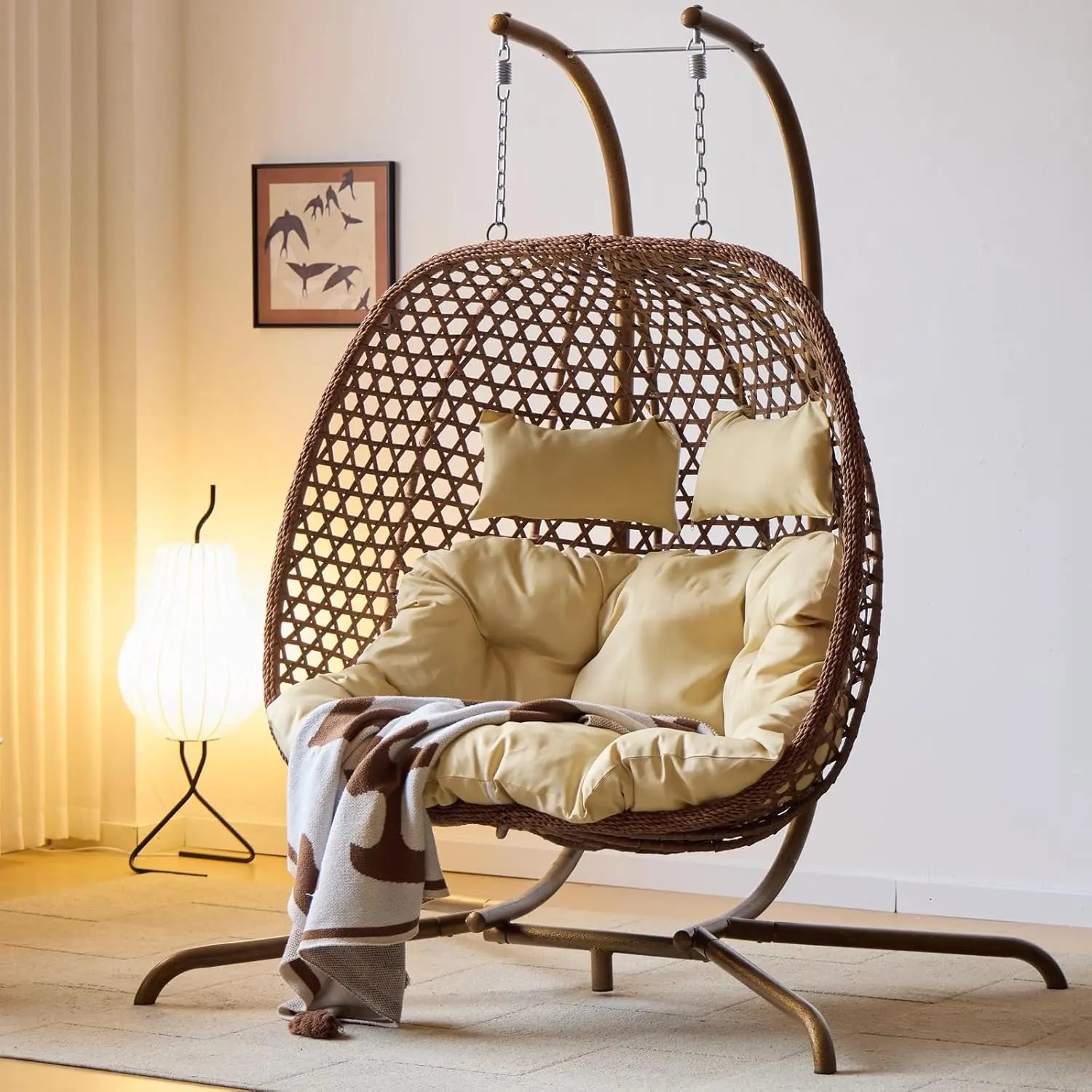 - 【Extra Comfortable】Thicken cushion with high density cotton filled that you will never feel the structure of your rattan wicker hanging chair with stand. Thicken steel pipes, reinforced seat of the swing chair for bedroom, strong hook and double chains can hold up to 350lbs the swing seat safely.