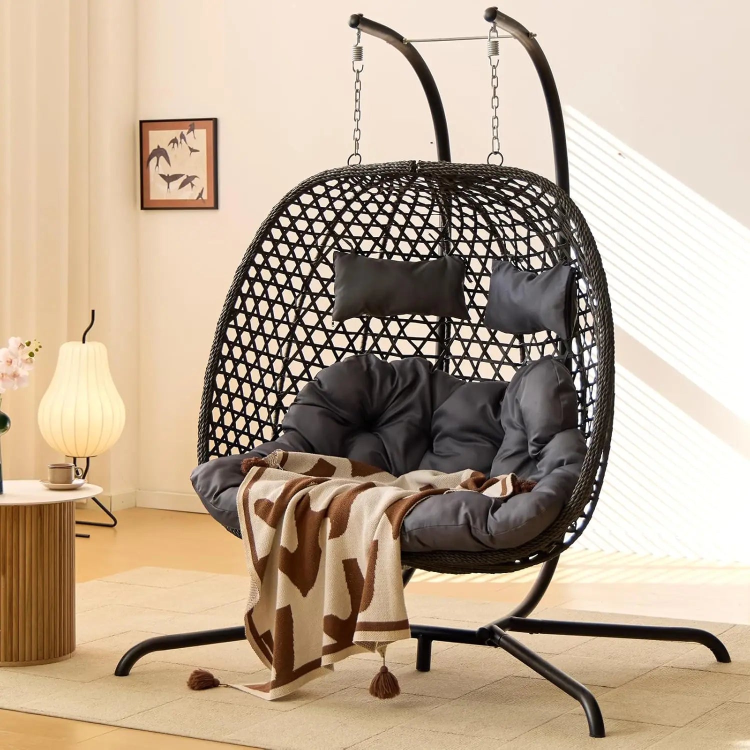 • 【Humanized Details】(1)Double suspension chains support high-level safe swing. (2) Foldable design, makes the egg chair indoor convenient to transport and store. (3)The egg shape of hammock chair swing makes the middle spacious, so you don't feel crowded. (4)Safety belt helps to fix the basket on the stand, which prevent violent shaking.