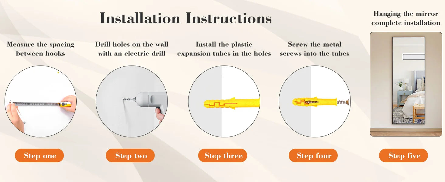 ALL-MATCH: No Assembly Required. The floor length mirror can stand anywhere with the standing holder. You also can lean it against a wall, or you can hang it horizontally or vertically on the wall for space-saving. It is suitable for a bedroom, living room, cloakroom, home gym, corridor, clothing shop, etc.