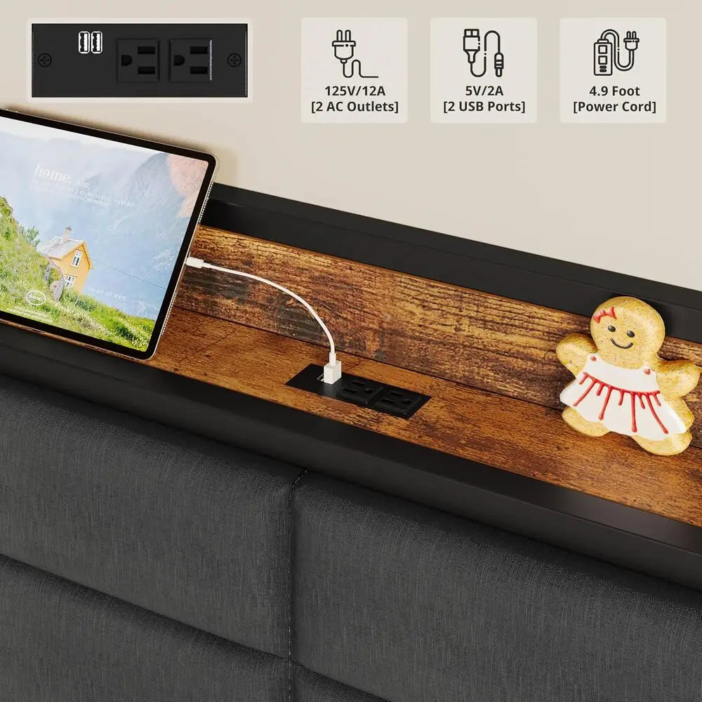 - Upholstered headboard with charging station: Sink into comfort while keeping your devices powered up at arm's reach.