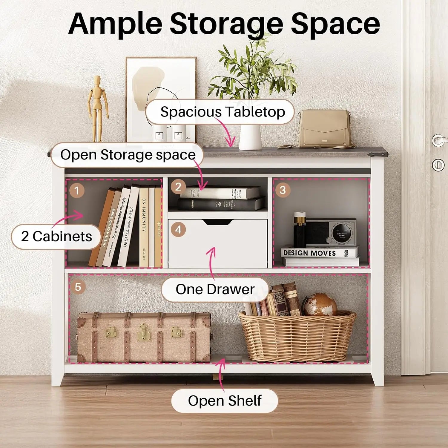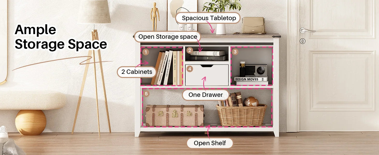【Spacious Storage Space】Spacious 45.9''L x 14.1''W tabletop provides ample space for displaying decorative items, 2 side cabinets , a middle open cubby and a convenient drawer, allowing personalized storage space for items of varying sizes. Additionally, the below open shelf height of 12.2", provides extra storage space, keeping everything easily accessible yet neat and tidy.
