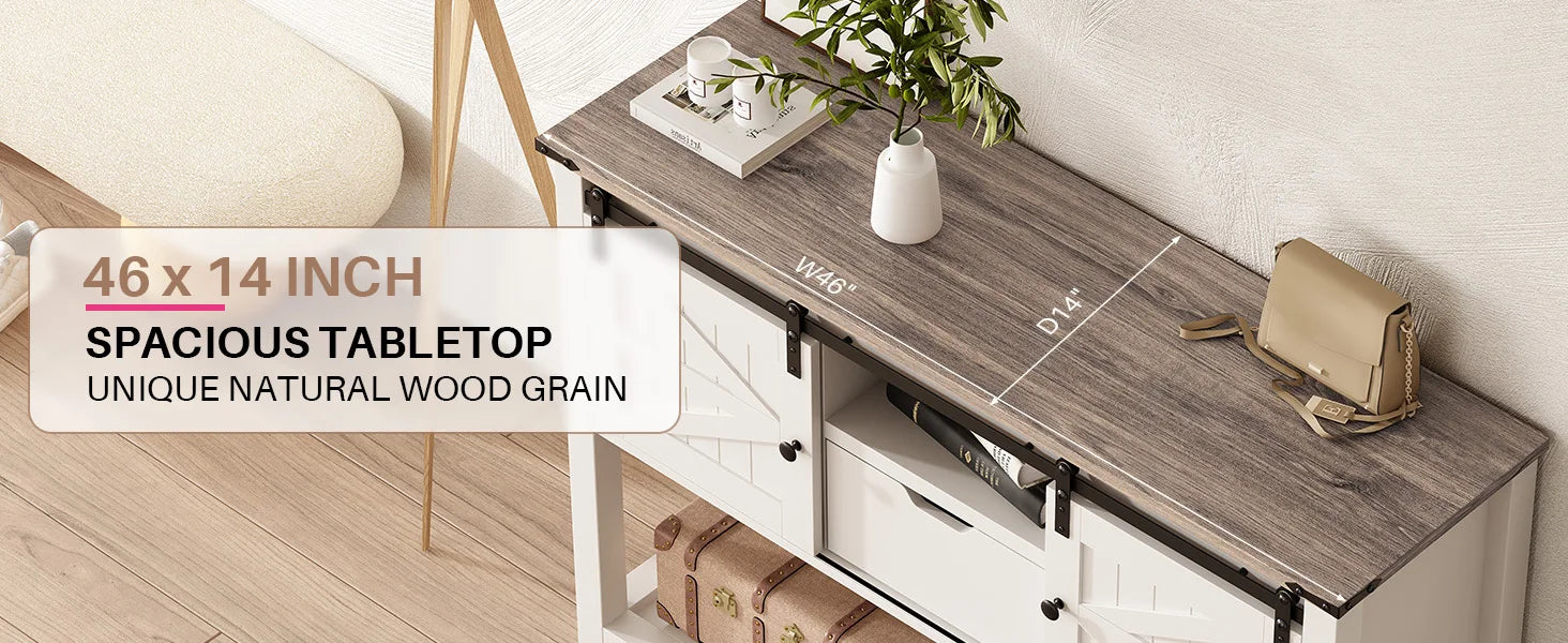 【Farmhouse Entryway Table】Our entryway table features classic barn door elements and a unique farmhouse wood grain surface, bringing a touch of rustic charm and cozy natural vibes to your space. Also, the metal trim adds a retro accent making this hallway table fancier and can perfectly blend into your farmhouse. Not only keeping the entryway neat and tidy, but creating a welcoming atmosphere for residents and visitors alike